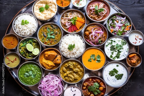 Traditional Indian thali with a variety of dishes including rice, curries, vegetables, and condiments, showcasing the richness of Indian cuisine