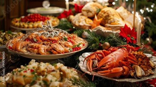 italian, christmas, eve, dinner, seafood, traditional, holiday, festive, decoration, shrimp, lobster, dish, food, celebration, christmas flower, candle, holly, meal, cookery, christmas dinner, italian cuisine, buffet, party, christmas party, table setting, decoration, holiday spirit