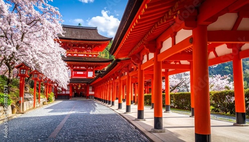 shrine, temple, japan, traditional, architecture, red, column, beam, paseo, roof, tiled, cherry, blossom, spring, nature, cultural, heritage, path, stone, tree, scenic, peaceful, vibrant, symmetry, wood, spiritual, structure, sacred, history, floral, serene, entrance, contrast, light, shadow, ritual, aesthetic, quiet, calm, harmony