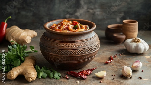 Traditional Korean-style kimchi in a handmade clay pot, with fresh ingredients like garlic, ginger, and chili scattered around for an artistic composition