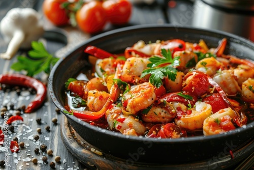 Traditional Mediterranean fish stew with cuttlefish, red and green peppers, tomato sauce, shrimp, and spicy herbs
