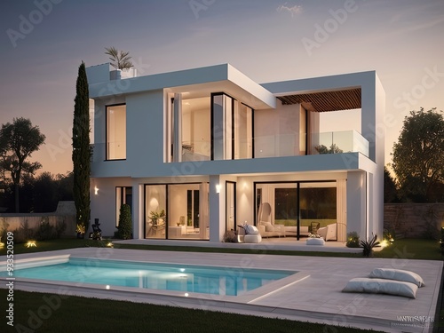 Traditional mediterranean white house with pool,Modern backyard of a swimming pool with house,Trendy outdoor modern house, awning and patio roof, garden lounge, chairs, metal grill surrounded by lands