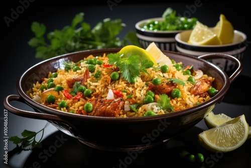 Traditional Mexican rice served with isolated green peas in the white background, generative IA