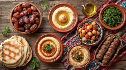 Traditional Middle Eastern Feast with Hummus, Dates, Olive Oil, and Grilled Meat on Rustic Wooden Table