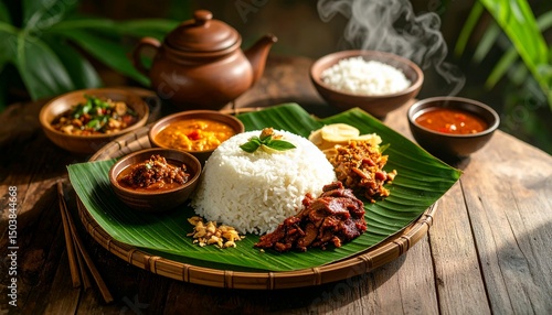 Traditional Nasi Lemak Dish on Leaf Plate Shot from Angle
