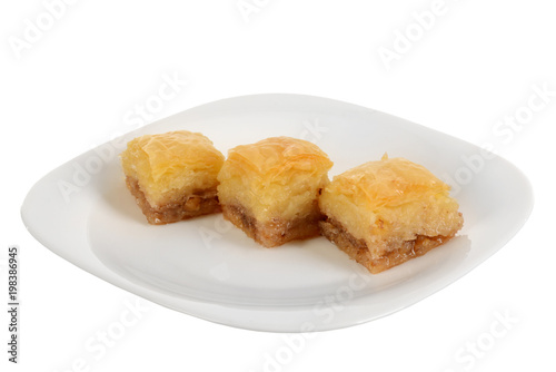 Traditional oriental dessert baklava with syrup.Three pieces of baklava on plate, isolated
