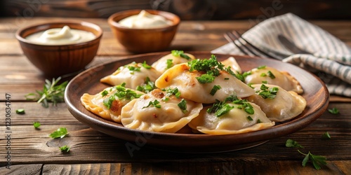 Traditional Polish pierogi filled with potatoes and cheese, served with a dollop of tangy sour cream on a wooden table, cheese, folk cuisine