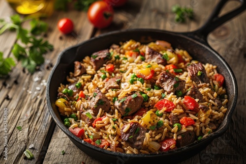 Traditional Saudi dish of rice and chicken in a cast iron skillet, surrounded by herbs on a dark wood background, aerial view.