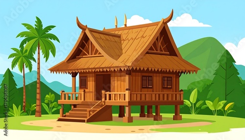 house, traditional, wooden, tropical, asia, southeast, architecture, home, dwelling, building, culture, heritage, village, rural, nature, landscape, palm, tree, mountain, sky, blue, green, brown, roof, tiered, elevated, cartoon, illustration, vector, art, travel, tour tourism, vacation, exotic, serene, peaceful, old, ancient, historic, design, exterior, sunny, day, summer, warm, climate, environment