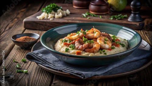 Traditional Southern Shrimp and Grits in a Bowl - Comfort Food, Southern Cuisine, Delicious Seafood Dish, Classic Southern Recipe, Bowl of Grits, Shrimp Dish, Comforting Meal, Southern Delicacy
