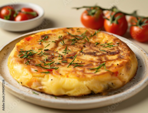 Traditional Spanish Tortilla Espanola garnished with herbs in rustic setting