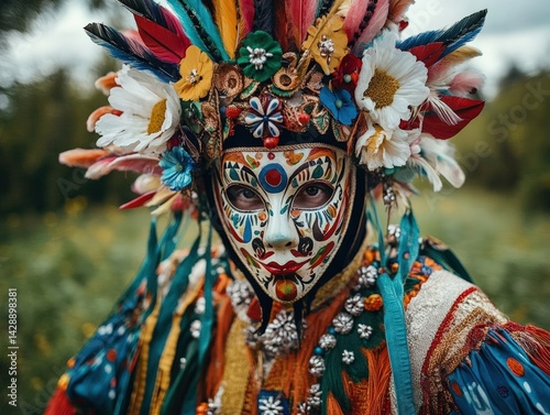 traditional spring folklore character with painted mask, vivid costume colors, mystical mayday setting