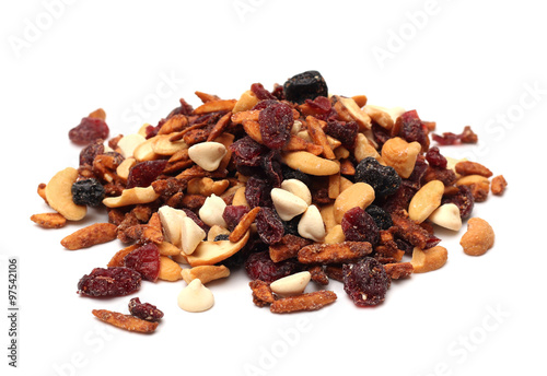 food, snack, nut, mix, healthy, unhealthy, background, closeup, macro, peanut, cashew, cranberry, raisin, yogurt, chips, white, chocolate, pile, mound, stack, heap, center, isolated