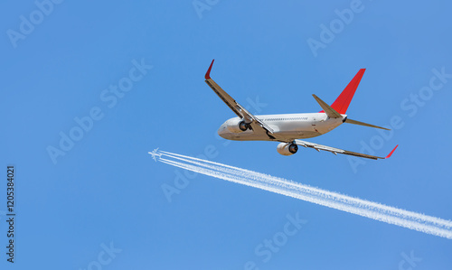 Trail of white smoke from the airplane on blue sky, airplane heavy traffic in the sky