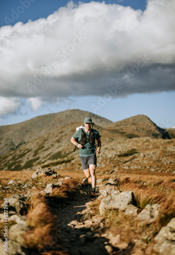 Trail runner runs along path with Mount Washington in the distance