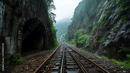 railroad track, railroad, tunnel, entering, mountain, rock, cliff, passing, mist, fog, day, travel, transport, transportation, adventure, exploration, landscape, nature, green, rocky, foliage, path, route, distance, rail, journey, destination, passage, cloudy, weather, overcast, remote, isolated, rural, environment, forestry, scenic, terrain, pathway