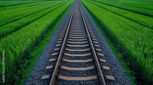 train, track, run, lush, green, field, clear, sky, railway, grass, vibrant, scenic, journey, sunset, open, travel, rural, nature, landscape, foliage, distance, highway, eco, ambience, serene, freedom, tranquil, stretch, retreat, summer, leisure, station, structure, signal, quiet, peaceful, farmland, topview, meadow