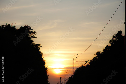 traction, rail, train, wire, sunset, evening, metal, sun, cloud, contrast