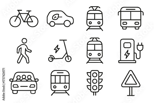 vector, icon, tram, signs, scooter, traffic, road, light, station, pedestrian, bus, bicycle, train, subway, car, electric, carpool, charging, collection, contour, set, symbol, line, outline, minimal, stroke