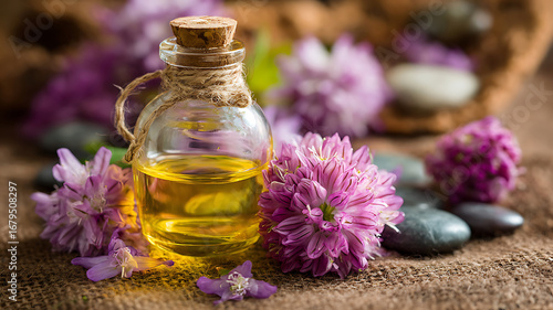 Tranquil Aromatherapy Scene: Golden Essential Oil with Purple Chive Blossoms and Stones