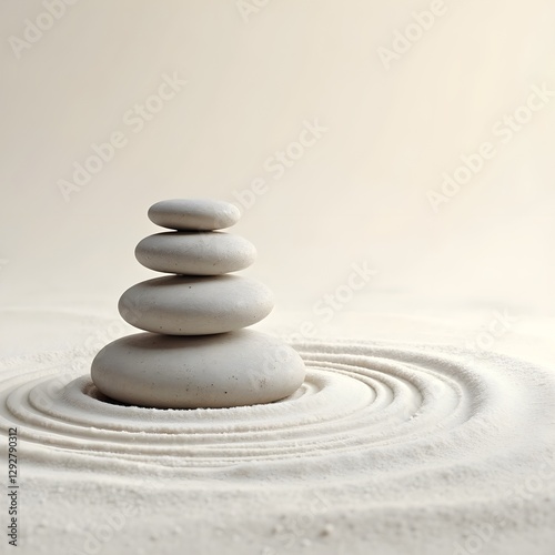Tranquil arrangement of zen stones on sand with delicate lines, symbolizing purity, harmony, and balance, perfect for spa and wellness themes.