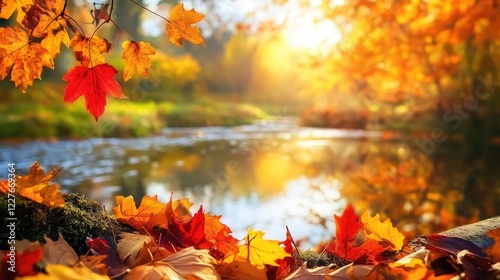 Tranquil autumn landscape with colorful leaves reflecting on a serene stream under warm sunlight