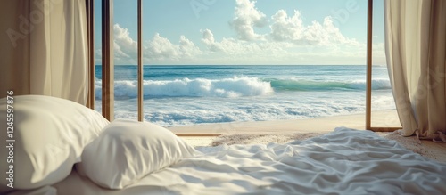 Tranquil beach room view with open glass doors framing frothy waves, soft white pillows in the foreground, and serene blue sky in the background.