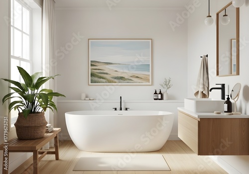 bathroom, interior design, modern, minimalist, coastal, spa, luxury, elegant, soothing, serene, clean, bright, airy, natural light, window, sink, vanity, cabinetry, plant, greenery, decor, artwork, mirror, lighting, fixture, faucet, storage, ottoman, rug, flooring, wall, home decor, residential, renovation, style, calm, relaxation, oasis, refreshing, peaceful, hygiene, cleanliness, comfort, sanitary