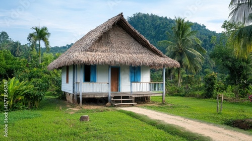 Tranquil countryside house with thatched roof surrounded by lush greenery and tropical vegetation in sunny environment