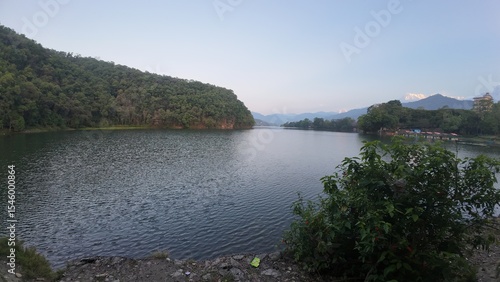 Tranquil Early Morning at Pokhara Lake: Serene Mountains and Calm Waters
