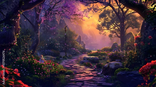 Tranquil Garden with Waterfalls and Flowering Trees at Dusk Image