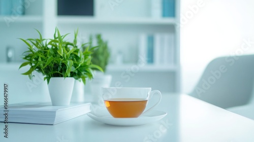 Tranquil indoor space featuring a cup of tea and a potted plant on a bright, modern table