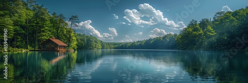 lake, bungalow, tree, forest, water, sky, cloud, sun, green, blue, white, wood, nature, landscape, tranquil, serene, peaceful, calm, beautiful, summer, day, outdoors, natural, scenery, environment, rural, idylli, get-away, vacation, holiday, relaxation, photo, image, art