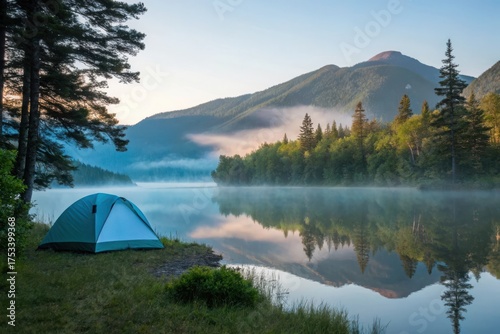 camping, lake, dawn, mist, mountain, nature, calmness, adventure, scenery, landscape, travel, relaxation, tent, wilderness, peaceful, environment, exploration, water, tree, horizon, sunrise, fog, serenity, hiking, escape, beauty, summer, morning, get-away, campground, stillness, wildlife, natural, scenic, vacation, journey, fresh air, recreation, leisure, natural beauty, still water