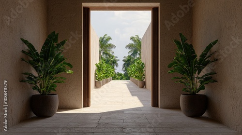 Tranquil Minimalist Interior Tropical Plants Open Door Sunlit Pathway