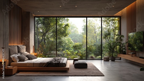 Tranquil Modern Bedroom with Floor-to-Ceiling Windows Overlooking a Lush Green Garden, Inviting Natural Light and Serenity into the Indoor Space
