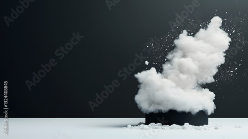 Tranquil monochromatic snowscape enveloping a meditative black plane with wispy white flurries cascading through a contemplative void This abstract digital painting features a refined