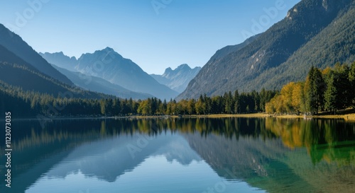 Tranquil mountain lake with reflections in autumn