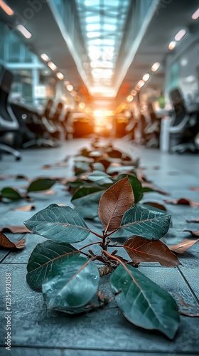 leaf, autumn, fall, office, workplace, interior, modern, design, bokeh, light, sun, floor, calm, serene, peaceful, tranquil, quiet, empty, space, minimalist, corporate, business, professional, building, architecture, natural, organic, tree branch, plant, greenery