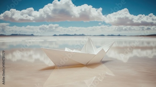 paper, boat, lake, cloud, sky, water, tranquil, calm, peaceful, white, origami, still, nature, landscape, sunlight, horizon, cloudscape, serene, quiet, stillness, beauty, dreamlike, imagination, minimalism, simple, art, design, photo, image, picture, pastel, light, colours, soft, subtile, texture, detail, surface, symmetry, harmony, composition, element, abstract
