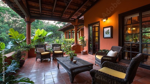 Tranquil Patio Lounge with Rattan Furniture Tropical Decor and Garden View Seating Arrangement