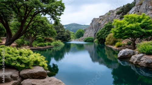 Tranquil pond reflecting lush greenery and rocky hills