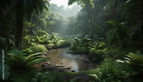 Tranquil scene of tropical rainforest with flowing water and ferns generated by AI