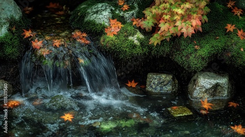 Tranquil Stream with Autumn Leaves Falling Gently on Mossy Rocks, Creating a Serene Atmosphere in Nature's Beautiful Garden Setting