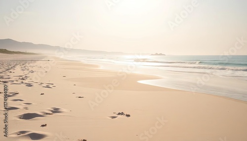 Tranquil sunrise beach, footprints in sand, ocean waves, distant mountains. Use travel, vacation