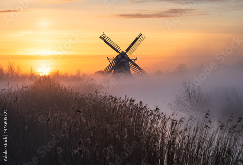 Tranquil sunrise with traditional windmill and a canal in the spring fog.