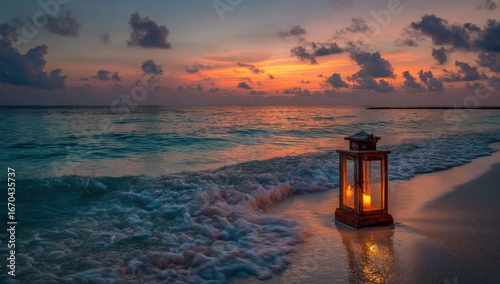 Tranquil sunset over the ocean with a lantern on the beach