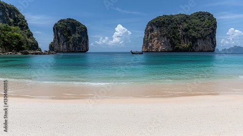 Tranquil Tropical Beach Scene with Turquoise Water and Limestone Cliffs