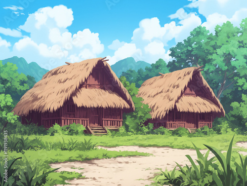 village, hut, nature, grass, forest, peaceful, rustic, traditional, wooden, house, simple, cosy, exterior, scenery, landscape, summer, idylli, rural, cabin, countryside, farmhouse, design, art, illustration, drawing, digital, warm, sun, cloud, mountain, tree, path, plant, vegetation, brown, straw, thatched