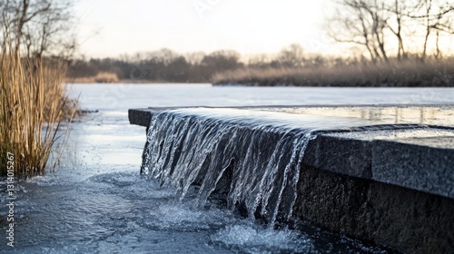 water, stone, spillway, nature, landscape, serenity, flow, river, duck pond, winter, ripple, environment, peaceful, morning, calm, scenery, aquatic, sunlight, season, beauty, frosty, grey, wet, texture, calmness, stillness, grass, edge, rock, cool, crystal, fresh, dripped, surface, liquid, surround, waterway, natural, view, scenic, sparkling, ecosystem, wildlife